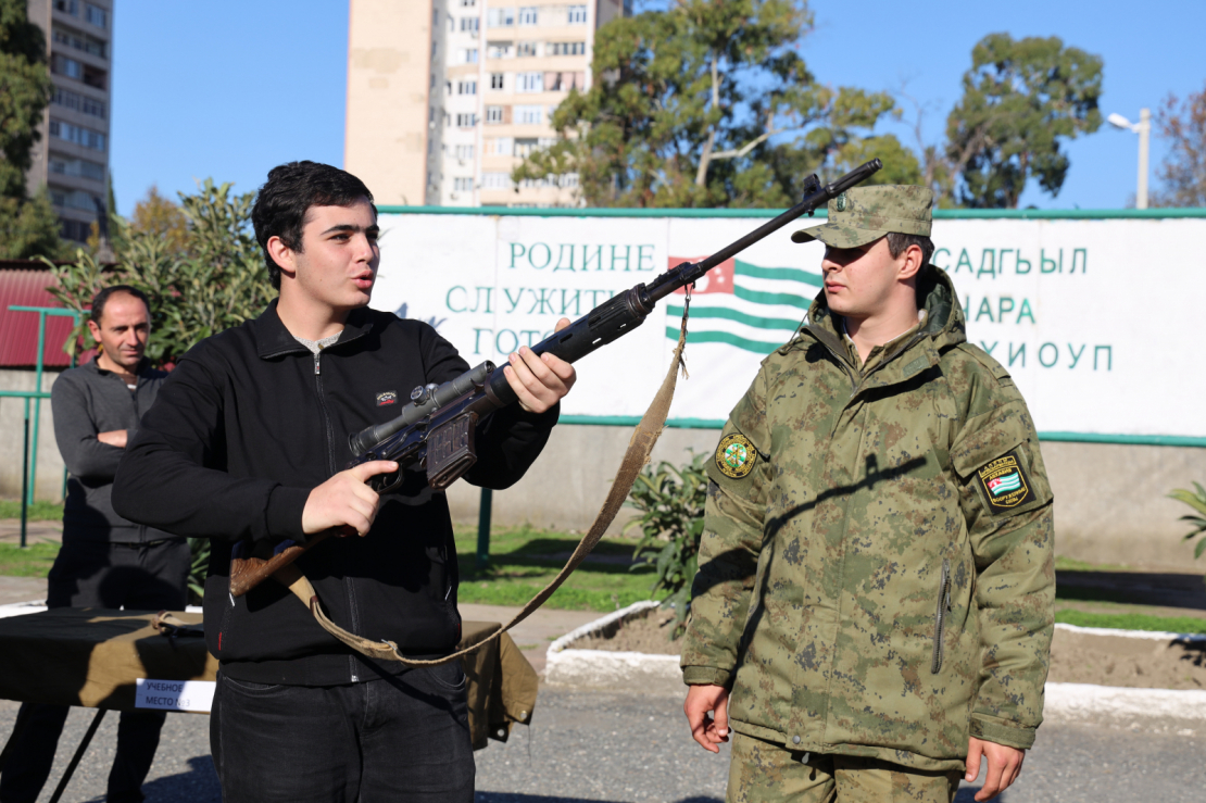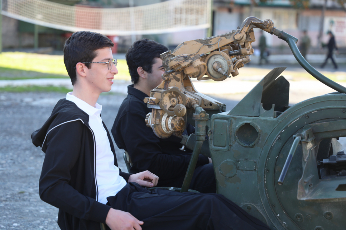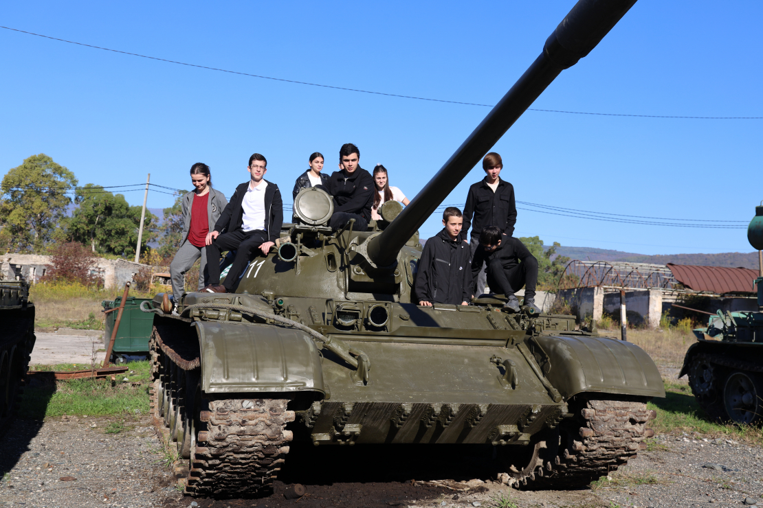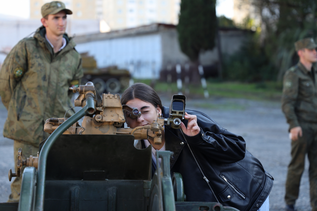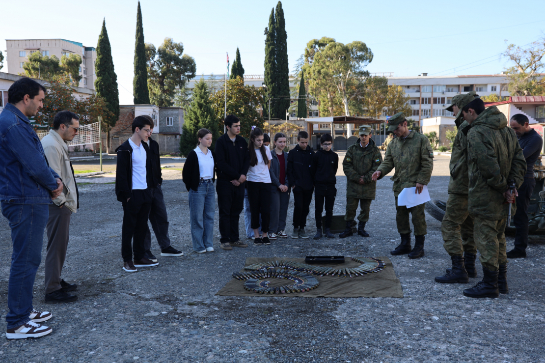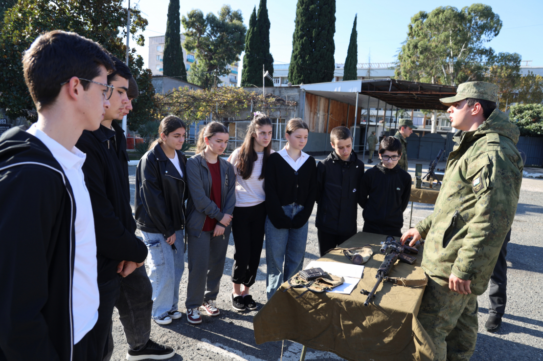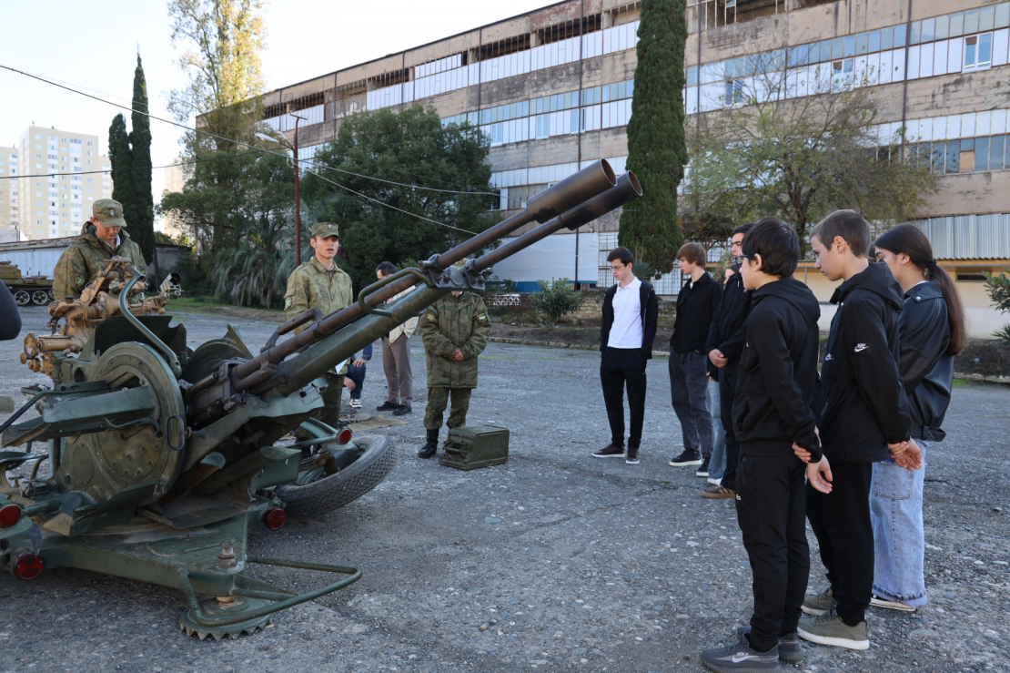 Программа дня была насыщенной и включала в себя два этапа. Сначала ученики посетили одну из воинских частей Сухума. Здесь им рассказали об устройстве и видах стрелкового оружия и различной военной техники.